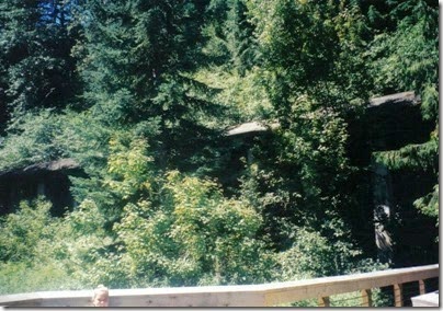 The Iron Goat Trail goes around the collapsed section of the snowshed on a wooden pathway. East of the collapsed section, the Iron Goat Trail moves into the snowshed, and hikers walk for over a quarter mile under the cover of the massive structure. This picture shows my sister Andrea at the point where the trail enters the snowshed.