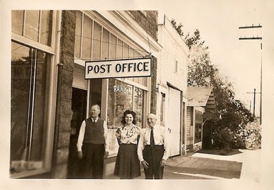 William Proctor, Margaret Lucker & William Reid in front of the Post Office in the Ellis Block.